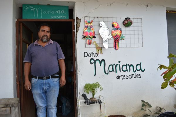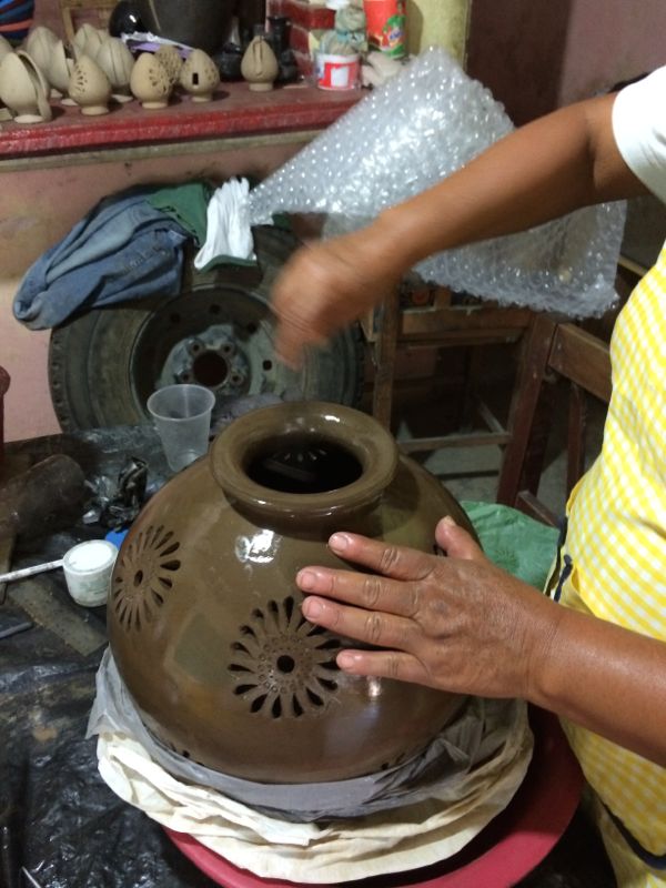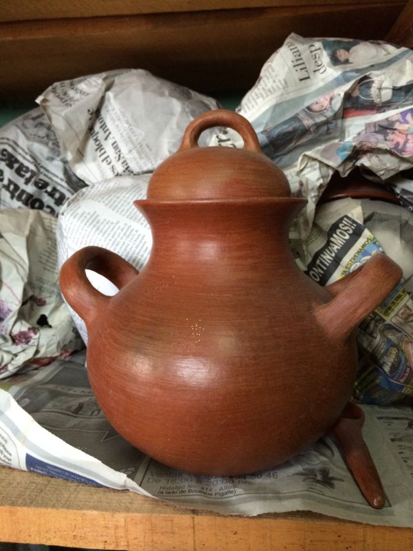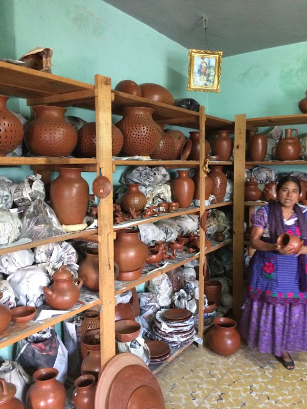 家族経営の小さな工房。前回、エリスさんと一緒に訪れた工房、ありました!!昔の在庫達!今はほとんど作られなくなった3FOOT!3本足の陶器達。モンテアルバンから出土されてた土器はこのような足付きの物が多く、70年代ぐらいまでは一般的なスタイルでしたが、観賞用としての技術を追求(細かい柄など)していくうち、足が必要なくなり、先の写真のように蔦でできたリングを使うようになりました。現在、作られてる物の多くは底が丸く、模様が細かく、蔦を使って飾るのがほとんどです。このように3本足の物や動物モチーフはあまり見かけなくなったのですが、あるところにはあるんですね!昔ながらの作品を作り続けてる、貴重な工房です。三本足の物は全部買って新たに注文してきました(笑)フェニカでお願いして世界観を出して頂きたいです。