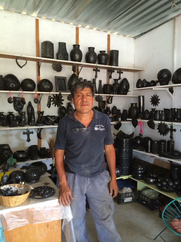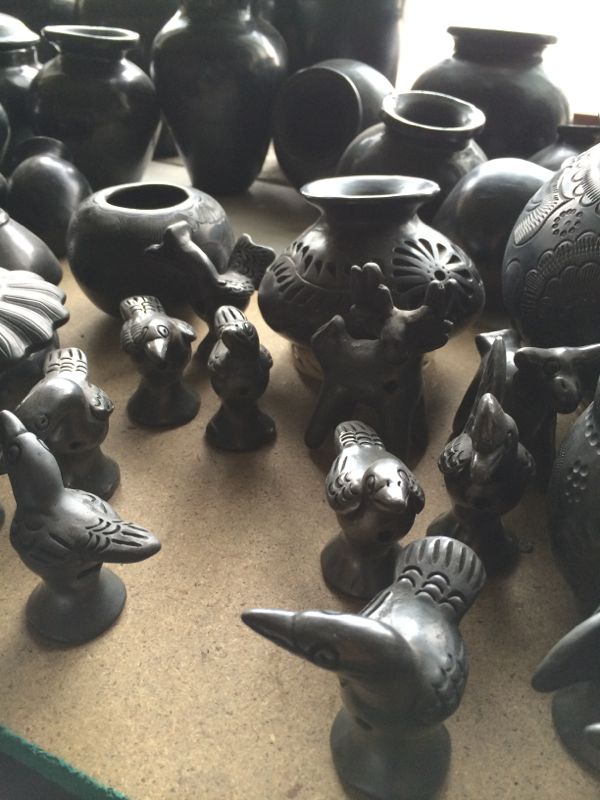 モンテアルバンに代表されるこの地域の遺跡から出土される陶器(土器)たちは皆この地方独特のBlack Cley、黒い土を使った土器でした。実際に使用されてた土器たちはみなグレーっぽい、メタリックな色合いでしたが1900年初頭、Dona Rossaさんという一人の女性がこの土を使い、焼きの温度を調整し、世界で初めて`黒い陶器`を作りました。ナチュラルな黒、磨けば艶がまし、世界中にその陶器は知れ渡り、Barro Neguro, Black Pottery = Dona Rosa ブラックポータリーと言えばオアハカのドーニャロッサ、と、代名詞的な存在になっていきます。 実際、現在でもドーニャロッサさん(1990年代初頭に他界されました)のお孫さんが工房を引き継ぎ、素晴らしい作品が作られてます。村の産業として確立されました。