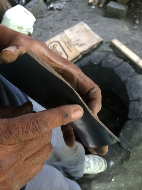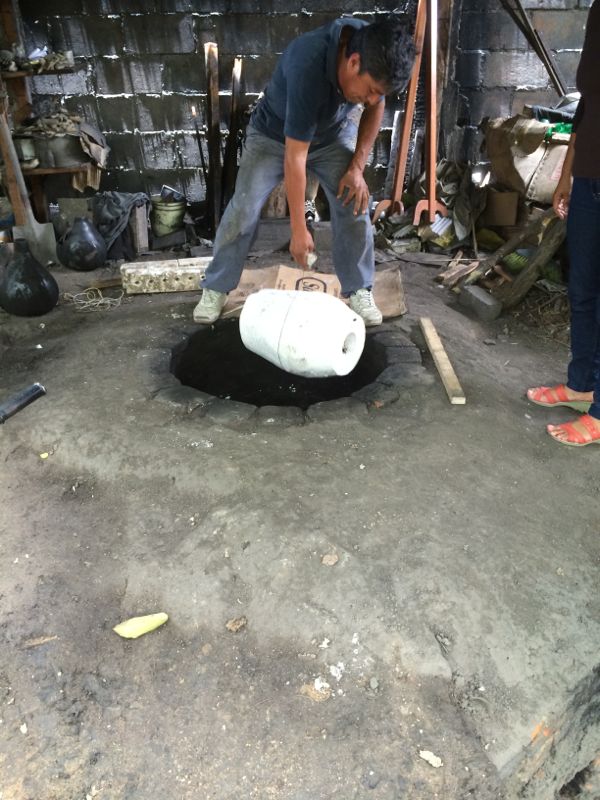 そんなに温度は高くなく、時間も短くていいのでガスで焼いてます。900°ぐらいが一番黒くなるとのこと、1050°以上だととけてしまう、温度を高くしすぎないように、厚みや形でいかに黒く焼き上げるかがポイントだと。いろいろ作品を見せて頂きましたが、一般的に好まれる`黒い`ものより、古代遺跡から出土される`メタリックグレー`色に惹かれます。。。Matte, Metaricoと呼ばれるもので実用性という意味では良いのですがやはり黒くて艶があるもの(ドーニャロッサスタイル??)が売れるのであまり作られることがないとのこと。 昔から`メタリックグレー`という色に滅法弱い(笑)のでどうしてもその`グレー`に惹かれてしまうのです。古代の人たちが実際に使ってた、そんなロマンをかき立てられるメタリックグレーな陶器、まさに土器、欲しいですね〜〜 作って頂きましょうか!シンプルな物で良いのです。古代のピラミッドで使われてた、そんなイメージな土器が欲しいのです!