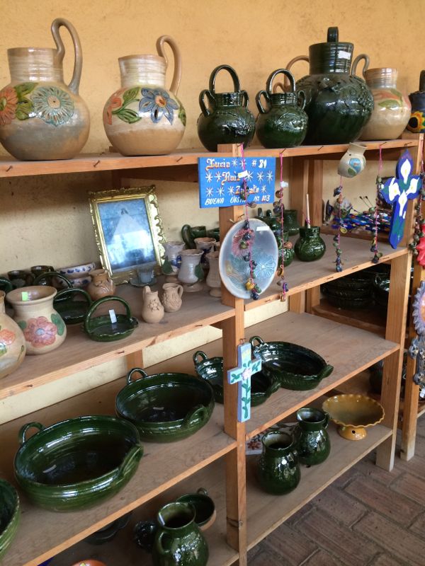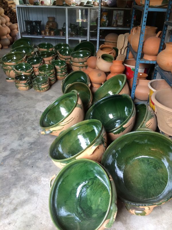 こちらは緑色の釉薬がかかった陶器達。Barro Negroに比べると値段も安く、日常使いに適した陶器達です。市内のレストランでもよく見かけるもので1つ1つ手作り感のある、まさにメキシコ、オアハカの民藝品といった趣です。沖縄や小鹿田、益子、出西など日本の陶器たちのレベルにはかないませんが、素朴な趣、なんか忘れてたものがある、世界の民藝品のひとつとして、フェニカのお客様には確実に響くと思います。