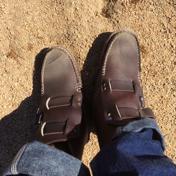 2ストラップダブルリングのハイカット`グラデュエーターモカシン`最強の1足です。砂漠なのでガラガラヘビ`Rattle Snake`とかうじゃうじゃいるのかな?!なんて期待して、写真に収めたいが、かまれたら嫌、、かといってウエスタンブーツなんかはいていきたくないし、そんなときのモカシン(笑)よりいっそう、地球にやさしい(?!)ダブルレザーソール。街中、コンクリートの上だと雨が降れば必ず滑る、危険な1足ですが乾燥した砂漠の砂地では最高の履き心地!まさにこういうところを歩くための1足ですね。ガラガラヘビ対策でハイカット、そこにオアスロウのインディゴデニムペインター、インディゴは匂いか色をガラガラヘビが嫌うと聞いてて、本当かどうか試してみたくて(笑)