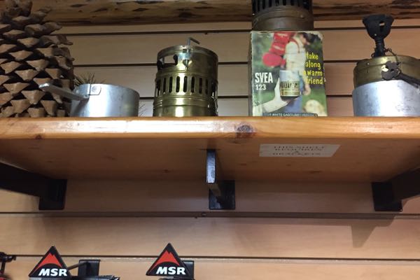 最新のMSRやSNOWPEAKにはかないませんが、こういった道具たちからこういう風に進化したんだと、こんなにも使いやすく便利になったんだと、さりげなく古い物と最新のギアを並べてるのが何とも言えない、格好良さ。(こういった古いアウトドアギアディスプレイの究極はコロラド州ボルダーにあるNeptune Mountainneringです)
