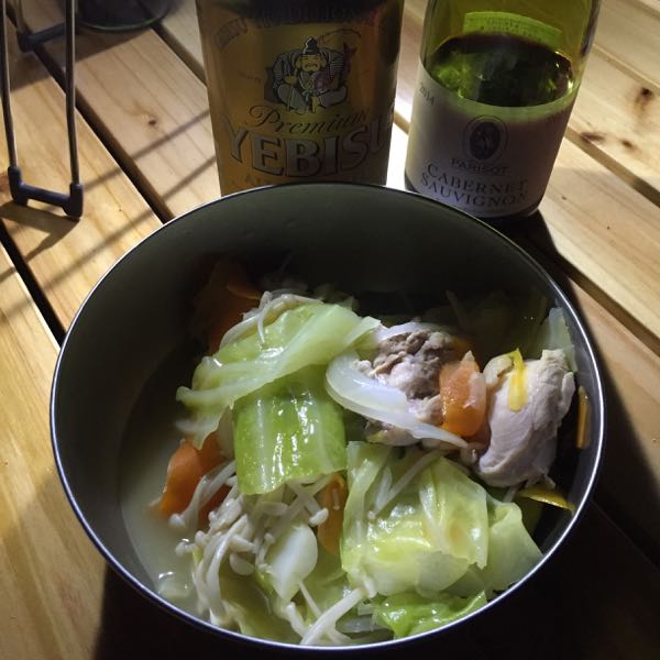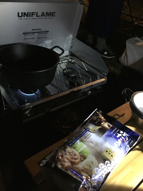 日が暮れるのが早いので、食事も楽しめます。夏は明るいうちからバーベキューがいいですが、秋はバーベキューはアウト、、食材がすぐ冷えるので、肉が固くなり、美味しくない、、やはりダッジオーブンで作る鍋がベスト、簡単楽チン、市販のスープでさっと仕上げます。
