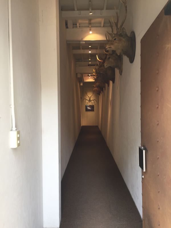 長いアプローチには鹿の剥製がお迎え。このエントランス造作は博多店も共通してます。