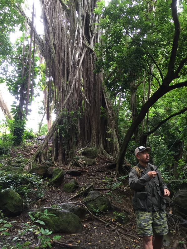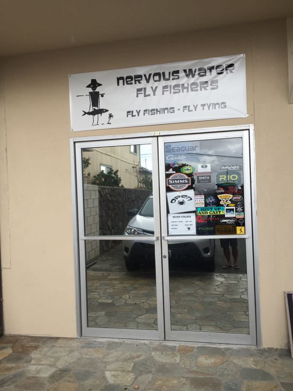 場所はマノアフォールズ近くのトレイル沿いに流れる川、レインフォレスト保護地域、あの`ロスト`の撮影現場、まるでジャングル、釣りしながら周りの景色にも圧倒されました。と、この辺までは日本にいても情報収集可能、あとは現地での情報をと、ハワイで唯一のフライ専門店へ。