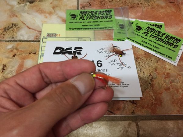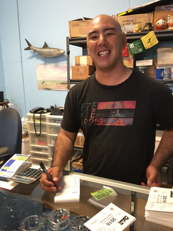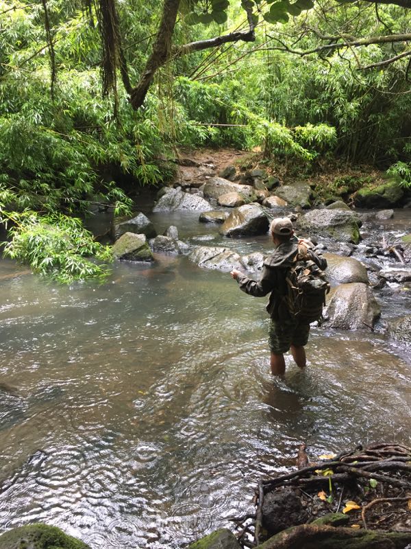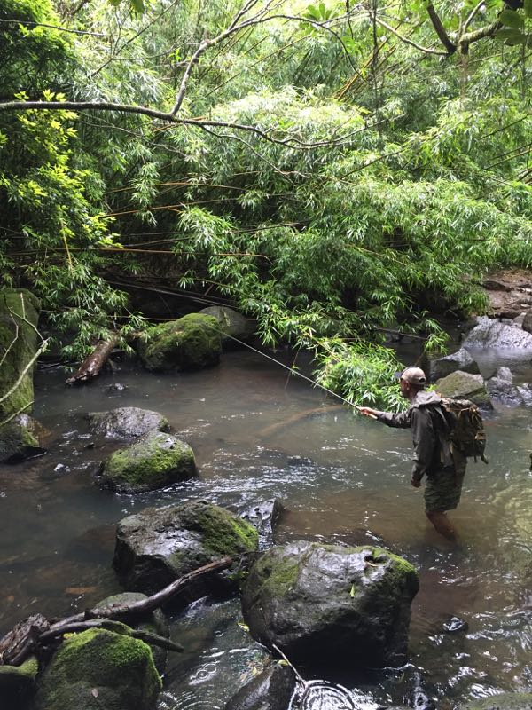 いや〜〜さすがプロ、詳しい。もちろんテンカラご存知、マノアフォールズ近くの川、滝まで行くと人がいるので行き過ぎない程度の川がオススメだと。スモールマウスバスもいるが`テンカラはドライフライだろ、ハワイには虫(川虫)いないぞ?!`と、、、えっ、知らなかった、確かに蚊もほとんどいなく、快適、そうなんだ、虫いないんだ、日本から持ってきたドライフライじゃダメかな、じゃあ、オススメのフライを幾つか買います。