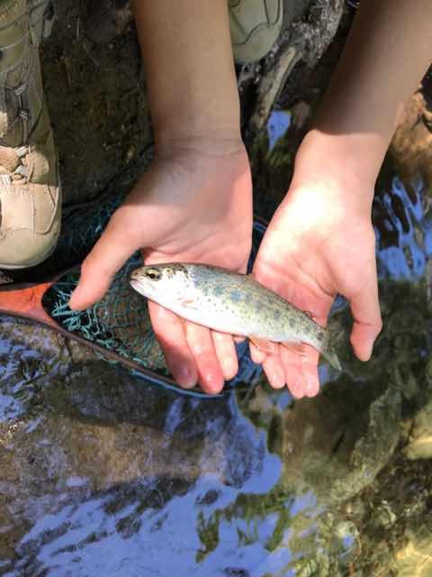 さすがにキャストは無理だったので、投げてすぐ、竿を渡し、ドライフライにガブッときた瞬間を合わせ、自分で釣り上げたヨセミテ レインボー!