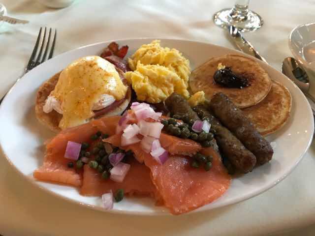 スモークサーモンにソーセージ、パンケーキにスクランブルエッグ、アップルスモーク ベーコンにポーチドエッグ、きゃーー大好物のオンパレード! 特にスモークサーモン美味しいー!ケイパーもたっぷりと。そして、この盛り合わせをもう一皿おかわり、デザートのフルーツ、十分元が取れ満足。