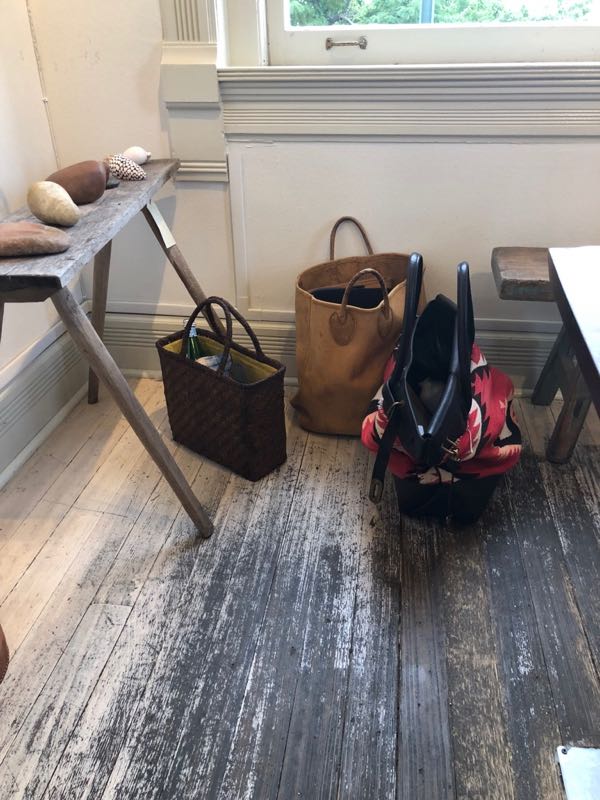 70`S LL Been のレザートートに山葡萄のカゴ。無造作に床に置かれてるのがいい。