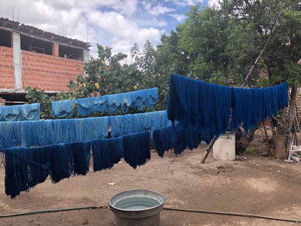 実際のインディゴはインディゴの木を刈り取り、煮詰めて、絞って、乾燥させて、石の様に凝縮させたものを使います。色の濃さは元のウールの色や天日干しにする時間などで調節します。厳密に言えば、全く同じ色っていうのはできない(かなり近い色はできますが)、天然染色ならではの色の良さというか、バランスがあります。