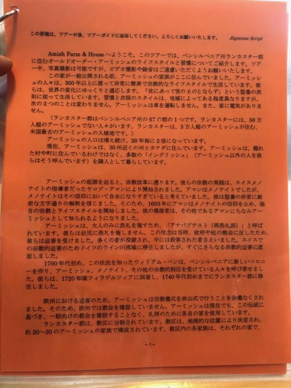 1700年代初頭、ヨーロッパで迫害を受け、アメリカに渡ってきた、ここランカスター郡に入植し、今でも300年前とほぼ変わらない生活を送る。