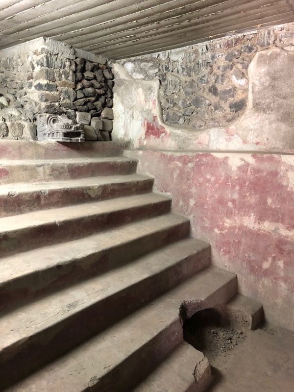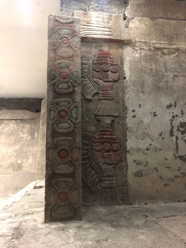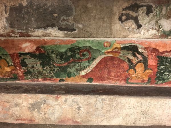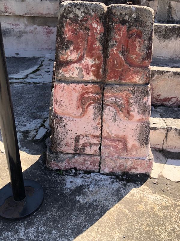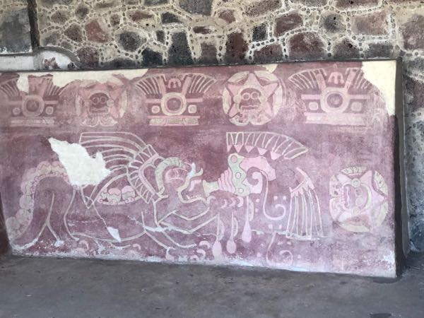 アステカ神話に登場する、雨を呼ぶ神様、農耕の神様とも呼ばれ、平和の象徴でもある。その姿は色々抽象画で書かれ、オアハカ ではラグのモチーフにも度々登場。メキシコのピラミッドはエジプトのとは違い、古代人の住居や祈りの場所、月や太陽、自然信仰、祈りを捧げる神聖な場所として、石を積み重ね、巨大なピラミッドを作った。発見された当時、周りにある活火山のおかげで、火山灰を被った状態、ほぼ空気にふれずにいたため、奇跡的に当時の色彩が残ってる。