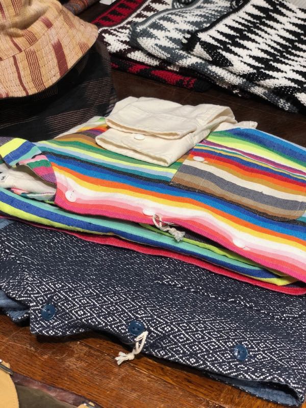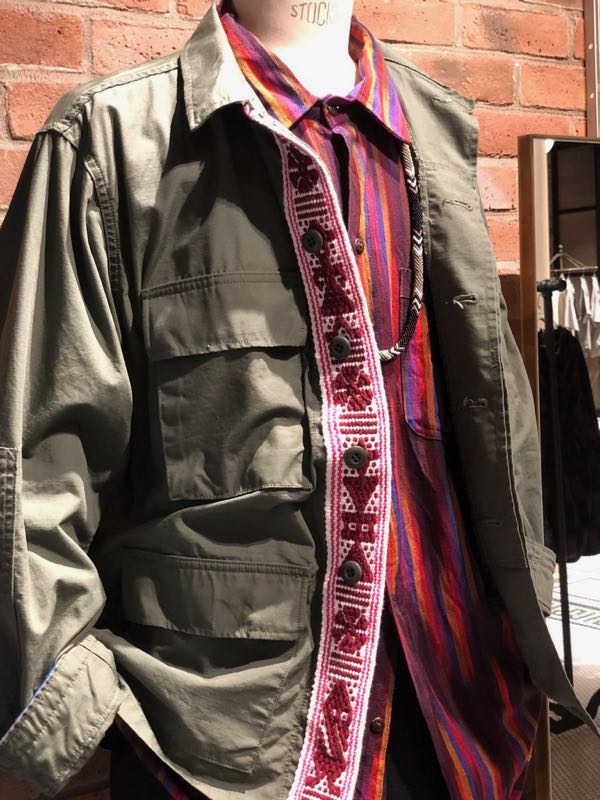 他にも、シャンブレーシャツやBDU ジャケットなど、ワークやミリタリーアイテムに刺繍やクラフト感を施したアイテムがオアハカ の特徴。1970年代のバックパックカルチャーに憧れがあり、そんなイメージをファッションに落とし込みたくて、色々物作りしてます。建前も大事ですが、やっぱ本音は`旅に出たい`せめて気分、ファッションだけでも楽しみたいです。