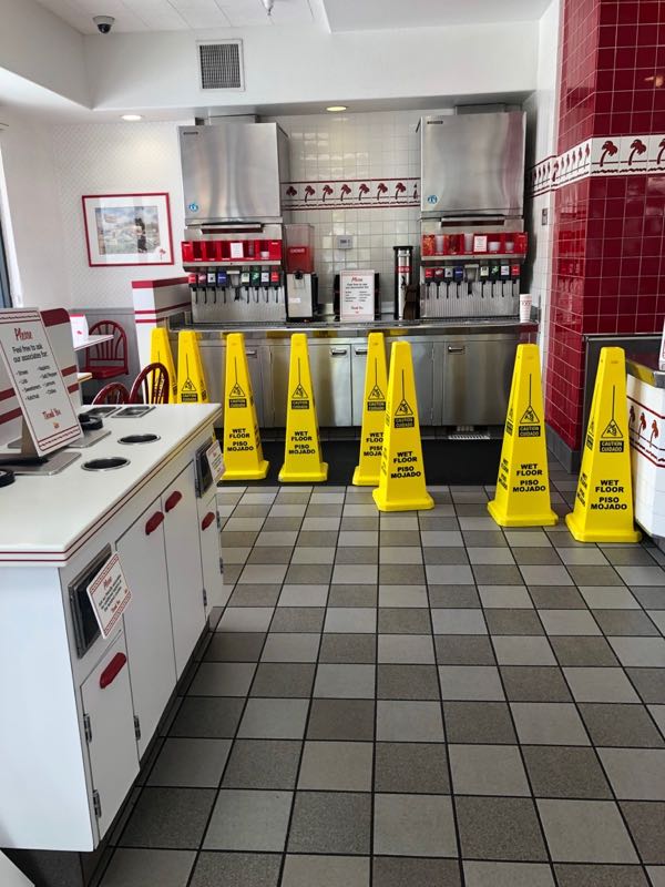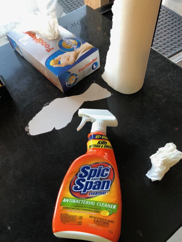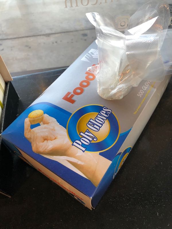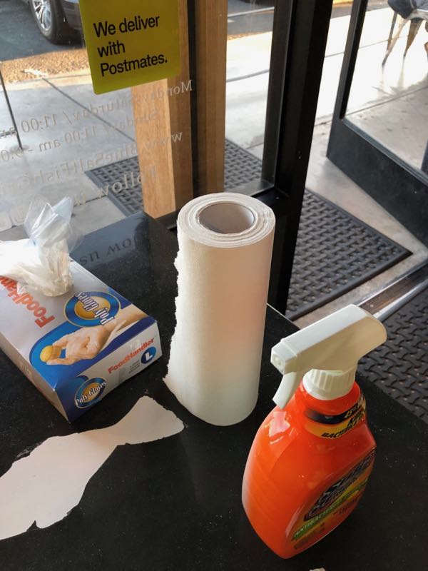 置いてる物も手袋や殺菌スプレーやペーパタオル。。あと、他ではバケツに水と洗剤が入ってるところもあった。。