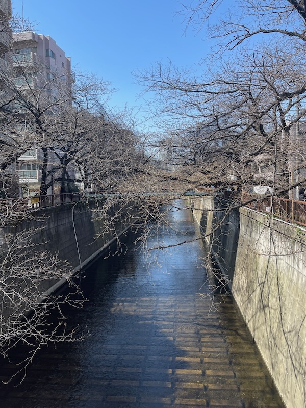 写真は3月上旬の目黒川、もうすでに提灯はつき、ちらほら咲き始めてます。
