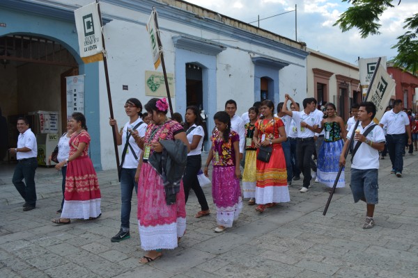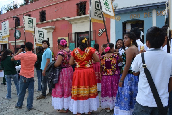7月にあるオアハカ最大のお祭り`ゲラゲッッア`たまたまパレードに遭遇、先住民族の伝統衣装を身にまとった女性達は本当にカラフルで美しい。1点1点手刺繍が
