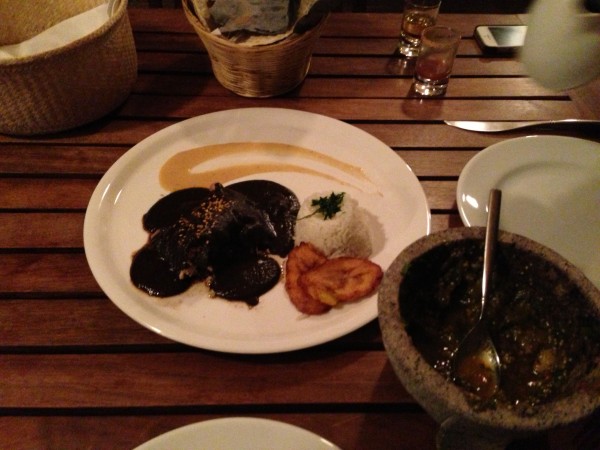 メインディッシュは`モーレチキン` モーレとはオアハカの郷土料理で甘くない、ビターチョコレートとチリを煮込んだソースで苦みの中にピリ辛感のある独特な黒いソースです。各家庭でレシピがあり、母から子へと受け継がれる味です。 脂身の少ない、チキンの胸肉に良く合います。